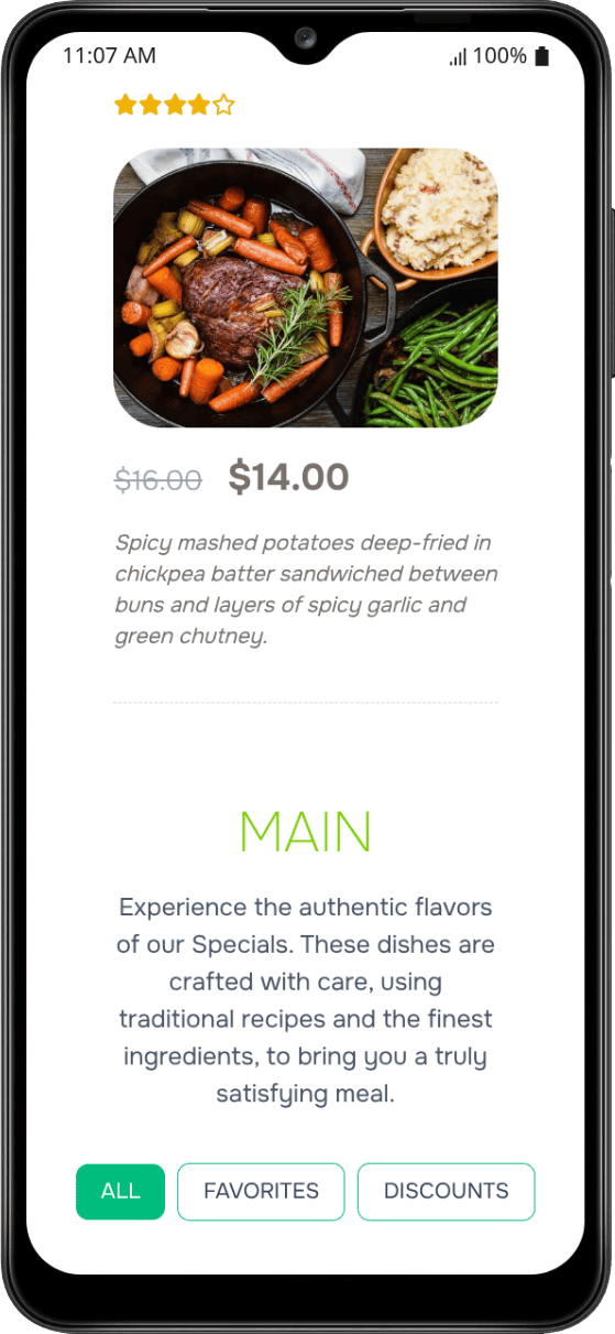 Even the buttons ("ALL", "FAVORITES", "DICOUNTS", "My Order") are rendered in the local language the second a guest scans: you define the exact translations by yourself!